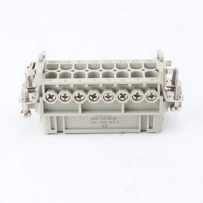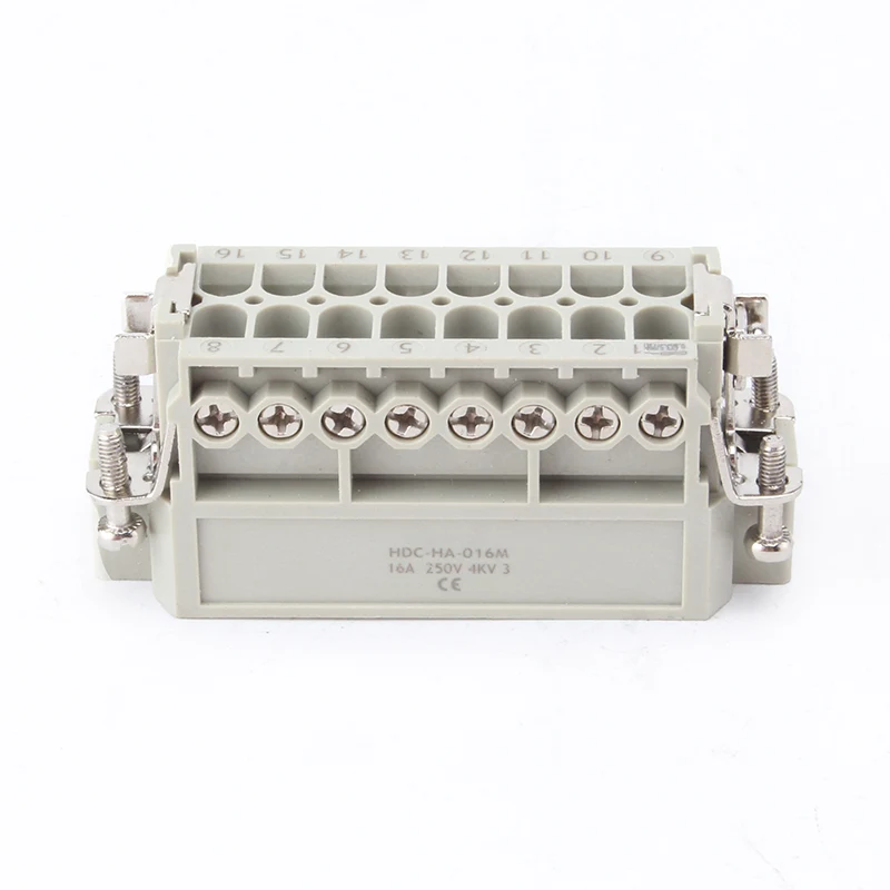 16A Тешките конектори за вметнување со 10 пински се женски и машки инертни делови. HA-016-M и HA-016-F се машки и женски дел, тие се усогласени како комплет. Тие работат заедно со алуминиумско куќиште од H16A. Компонентите за вметнување и надворешното куќиште заедно формираат комплетен производ за конектор. Изработени се од компјутерска обвивка и месинг иглички со сребрена облога. Сребрените иглички ги прават добро електричните врски.