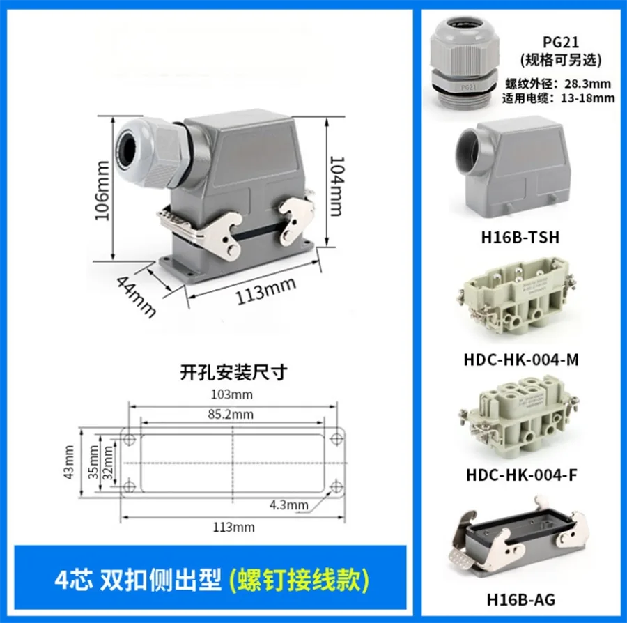 HK-004/0-M HK Тешките конектори работат под струја од 80А. Има 4 пина за контакт со жици. Нуди за различни работни услови и популарен се користи во автоматската индустрија и видовите на поврзување со жици на машината.