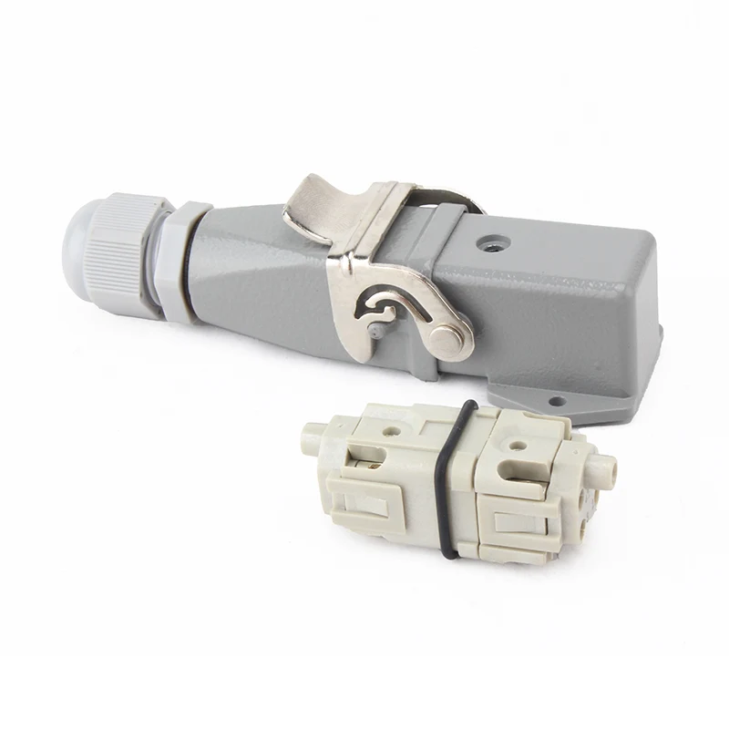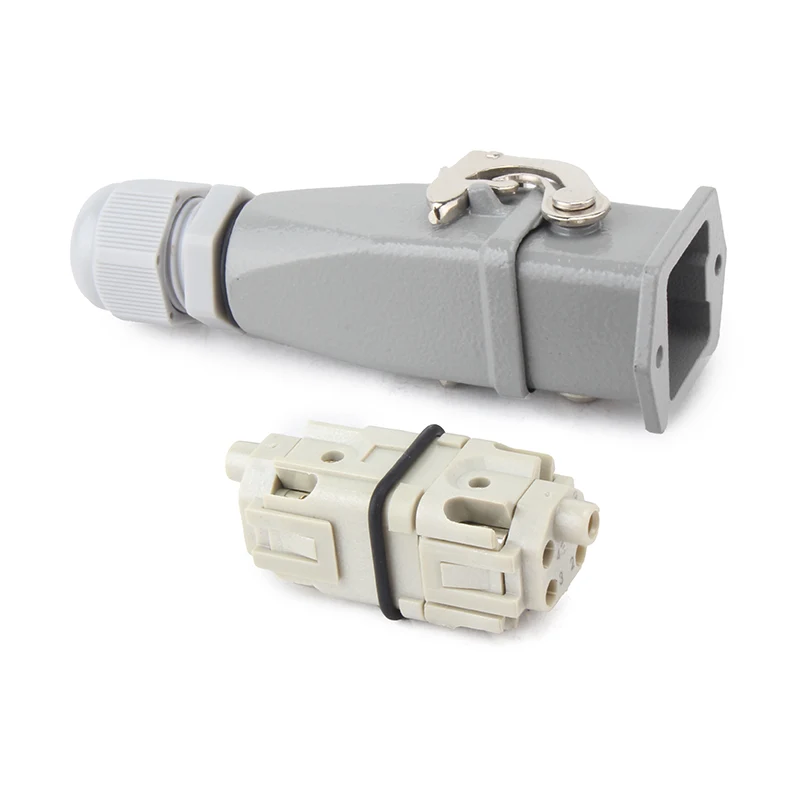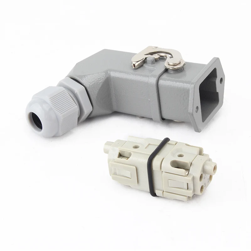Работен е со 10A H3A-MTG Housing конектор за тешка работа. M HA 4 Pin Insert Heavy Duty Connector е изработен од цврст материјал за компјутер и месинг обложен со сребро. Нашите пинови се обложени со сребро, многу добар квалитет и многу подобра електрична спроводливост. Склопен е со заптивна гума за да се направи подобра водоотпорна ситуација.